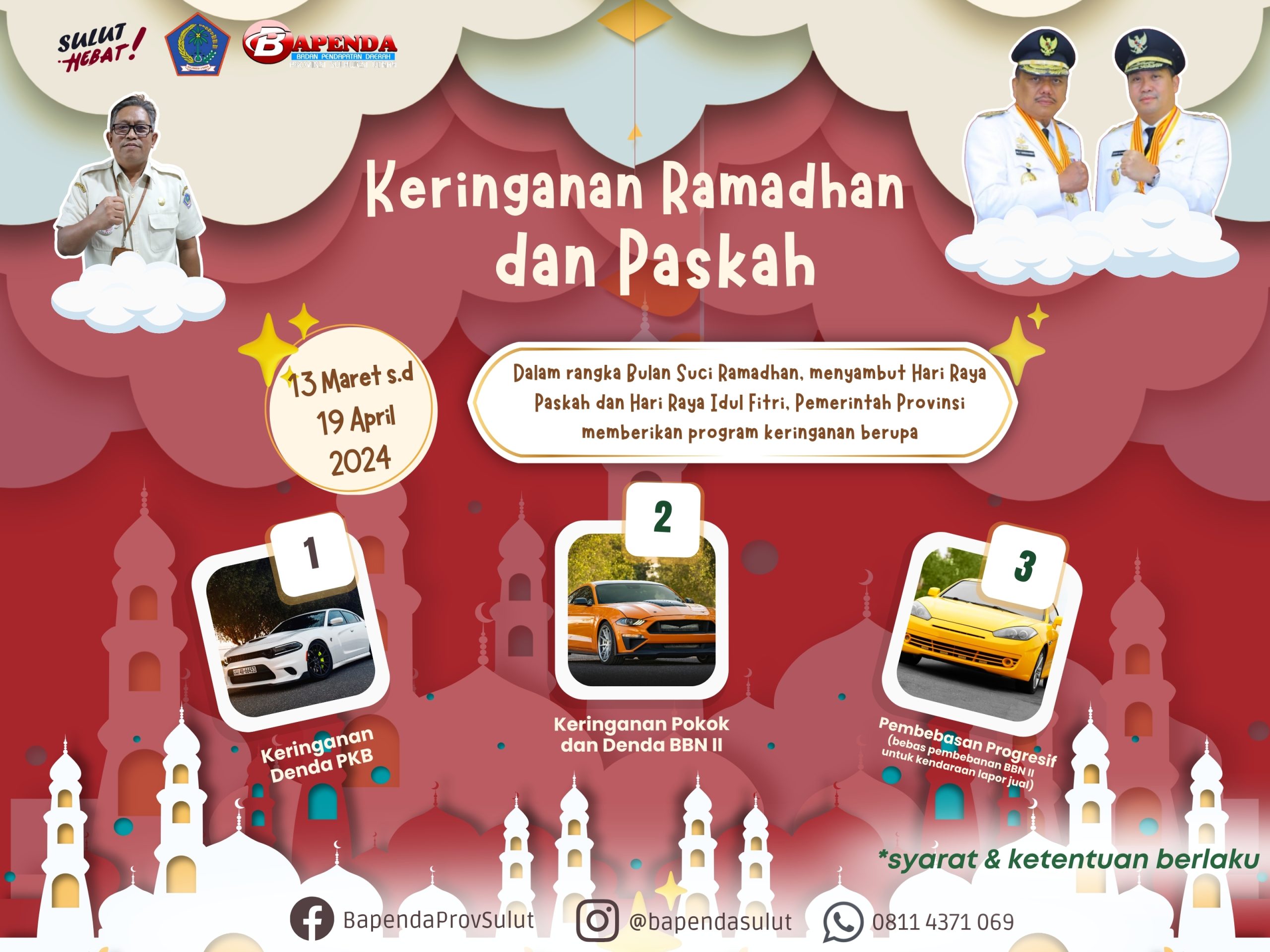 Keringanan pajak lewat program Keringanan Ramadhan dan Paskah yang mulai berlaku 13 Maret hingga 19 April 2024 ini meliputi keringanan denda PKB (pajak kendaraan bermotor), keringanan pokok dan BBN-KB (bea balik nama kendaraan bermotor) serta pembebasan Progresif.