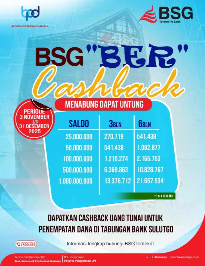 Program ini memberikan pengembalian tunai bagi nasabah yang melakukan penempatan dana di tabungan BSG dalam periode 3 November hingga 31 Desember 2025.