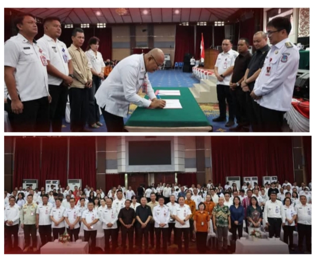 Usai sambutan Walikota, kegiatan dilanjutkan dengan penandatanganan Berita Acara oleh Walikota Manado, Anggota DPRD Kota Manado Reza Rumambi, Asisten II Atto Bulo, para Kepala SKPD, serta para Camat. (elka)