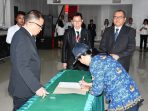 Pelantikan ditandai penandatangan perjanjian kerja oleh mereka yang dilantik dan penyerahan Surat Keputusan (SK) oleh Rektor.